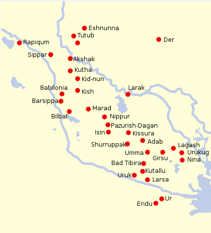 City-states of Ancient Sumer http://upload.wikimedia.org/wikipedia/commons/thumb/3/39/Ciudades_de_Sumeria.svg/436px-Ciudades_de_Sumeria.svg.png Irrigation Agriculture and Sumerian Civilization. The organization required to dig canals and dikes along the Tigris and Euphrates produced a greater level of specialization within the workforce than had occurred in the later Neolithic towns. To be effective, irrigation efforts had to be carefully planned by people who observed the flow of the water from year to year. Such people understood where the dikes and canals should be placed for maximum effect. At the same time, the dikes and canals themselves, channeling millions of gallons of water, had to be constructed sturdily and efficiently. This process also required the development of specialized skills in surveying and building. Once the water had been brought to the fields, of course, it was also important to know the best times for sowing, weeding, watering, and ultimately harvesting. This too required experience and knowledge, particularly of the seasons and the weather. Those who had such specialized skills and knowledge would naturally have emerged as the leaders of Sumerian society. The role of these specialists, however, also reflected the general Sumerian conception of how the universe worked. As had been the case in the Neolithic farming communities, the ancient Sumerians apparently believed that the natural world was essentially alive. Sumerians saw natural forces like lightening, rain, wind, thunder, and so on, as the physical forms of unseen spirits. They believed everything was inhabited by a spirit or god that gave it its shape and function, even the rivers, canals, reeds, and water. Quite naturally, since the specialists were dealing with the forces of Nature, these leaders of Sumerian society were also probably seen as intermediaries with the spirits that ruled the natural world - in other words, the gods. Thus they were not only agricultural specialists and engineers, but also priests. Indeed, the earliest rulers of the city-states appear to have been the ensi, or chief priests, who organized and oversaw both the general agricultural activity of the city as well as the worship of the city's chief god. This combination of spiritual authority with the practical knowledge that allowed Sumerians to feed themselves determined the overall character of early Sumerian culture and society. At the heart of this culture was a religious worldview that directly reflected the environment from which it had sprung. Sumerian religion. From the beginning, human history in Mesopotamia (as the whole region between the two rivers has come to be called) has reflected the nature of the land and climate in which it developed. The land is harsh, and the climate violent. For example, there are probably more lightening strikes in Mesopotamia per year than in any other region of the world. Thunderstorms and unexpected floods, killing dust storms and long months of drought, these are the elements of nature with which the early peoples of the land between the rivers had to struggle for survival. As might be expected, the violence of the climate and the harshness of the environment greatly affected their outlook on life in general. Although they had begun to depend on agriculture for their livelihood, Sumerians remained subject to the forces of nature. The Tigris and Euphrates were especially unpredictable rivers; some years they might be reduced to a trickle, others they might experience sudden, violent floods. As the early settlers in the region began to develop their cooperative skills, they also appealed to the spirits and forces of nature on which they depended. Sumerians naturally believed that these gods and goddesses were just as cruel, unpredictable, and violent as the natural forces that embodied them. Their gods like their environment were harsh and unpredictable. The whole character of Mesopotamian civilization thus became pessimistic rather than optimistic. With so much of their livelihood dependent on natural forces, Sumerians also came to see the gods and goddesses associated with them as the true rulers of their own lives. Under the leadership of the priests, people saw their cities as the property of particular deities. Indeed, the city became in a sense the embodiment of the god. When cities fought one another, Sumerians believed, it was because the gods were fighting. When cities cooperated (a rare occurrence), it showed the gods were friendly. They explained every aspect of existence with reference to the gods. Even in their architecture, Sumerians expressed their central concern with the gods. The most imposing building in any Sumerian city was the ziggurat, a great step pyramid structure, with ramps and staircases leading to the very top where the god's shrine or temple stood. Like a man-made mountain rising from the flat lowlands, the ziggurats were always built at the center of Sumerian cities. They dominated the landscape of Sumer as they dominated the lives of the Sumerians. (The mountain-like structure of the ziggurat may suggest that the earliest Sumerians came from a mountainous region. The word itself means "pinnacle" or "hilltop.)