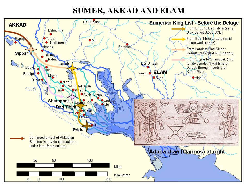 The earliest record we have of civilized life is found in the region traditionally called the Fertile Crescent, an arc of land running from the head of the Persian Gulf north to the mountains of southern Turkey, west to the Mediterranean Sea and then south along the eastern Mediterranean coast. The crescent thus encompassed all the fertile rain- and river-watered areas suitable for agriculture that bordered the great Syrian Desert. The most important land in this region lay between the two great rivers, the Tigris and the Euphrates. From their sources in the highlands of eastern Turkey, the Tigris and Euphrates flow southeastward towards the Persian Gulf. To the east lie the Zagros Mountains and beyond them the great Iranian plateau, with its high deserts. To the west, beyond the reach of the Euphrates' banks, lies the Syrian Desert, which in turn reaches south joining into the deserts of Najd in central Arabia. In their northern reaches, the region traditionally called by the Greeks Mesopotamia, or Land between the Rivers, the Tigris and Euphrates are separated by as much as a hundred miles. About halfway down their length, the two rivers come within about thirty miles of each other, in a region known as Akkad. Further south they spread out again, in the region traditionally called Sumer. Finally, as they near the gulf the rivers come back together. They join in what today is called the Shatt al-Arab, a single great waterway that flows through soggy, reed-filled swamps until it reaches the sea. The great advantage of farming along the Tigris and Euphrates is the fertility of the soil. This fertility is due to the annual flooding of the rivers, which brings rich silt down from the highlands and deposits it along the river valleys. The annual deposit of silt, particularly in the Euphrates, is about five times greater than that in the Nile River valley. In the southern region, Sumer, the silt builds up. Frequently this causes the river to overflow its banks, sending floodwaters swirling unpredictably and destructively across the land. As rich and productive as the soil might be, therefore, it could only be used effectively by farmers after they had dug canals and dikes to control the floodwaters, channeling them to the fields. Such projects required intense coordinated labor. Out of that cooperative process the first civilization emerged from the dawn of prehistory. The Sumerianshttps://youtu.be/dxUAtvLy7_wSometime between 4000 and 3500 B.C., a new people migrated into the southern valleys of the Tigris and Euphrates Rivers, where they flowed into the waters of the Persian Gulf. At the time, the Persian Gulf stretched much further north than it does today, and the two rivers had not yet merged into the single watercourse that we know today as the Shatt-al-Arab, but flowed separately into the sea. We do not know where these people came from--perhaps the hills of Iran or Turkey to the north, perhaps even from the sea itself. Nor do we know to whom they were related, for their language is unlike that of the other peoples living in this region. Yet while their origins may be shrouded in the mists of time, their impact on all subsequent civilization in Mesopotamia can hardly by overestimated. They brought with them skills of organization and cooperation needed for large-scale irrigation farming. These skills would help to change the course of human history. For it was these people settling in the region of Sumer, and hence called Sumerians, who created the first true civilization we have so far discovered.