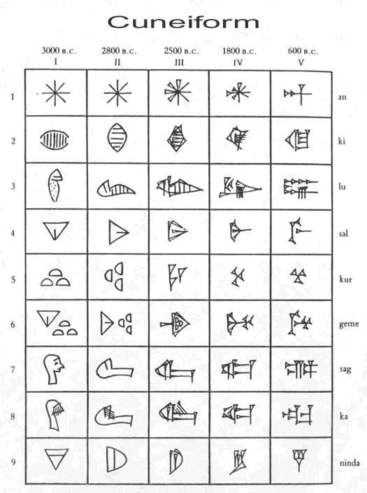 Record Keeping and Writing In addition to the city-state and the whole idea of kingship, the increased level of specialization in ancient Sumer led to perhaps the single most important invention in the story of civilization - writing. As the cities produced more and more food, and specialized artisans produced their wares for sale, it became important to keep records. For one thing the priests, who did not produce their own food, had to eat. Yet their specialized knowledge was essential for maintaining the irrigation works on which everyone's food supply depended. Consequently, the rest of the community supported both them and the gods they served. Such support, either in the form of agricultural produce or a specified number of days of labor on fields belonging to the gods, was the first form of taxation. Records had to be kept in order to figure out how much the agricultural workers owed in taxes. As artisans began to produce their own products, they too had to provide support for the temples. Consequently, they too had to keep records to figure out who owed them what, and how much they in turn owed the priests. Writing thus developed out of the need for keeping records. INTERNET RESOURCE Cuneiform Writing SystemInitially using as many as 2000 symbols, made by pressing a pointed stick called a stylus into damp clay tablets, which were then dried to preserve them, the Sumerians recorded the items that passed in and out of their storehouses. Because of the characteristic wedge shapes created by the stylus, modern scholars called the Sumerian style of writing cuneiform, from the Latin word cuneus, meaning wedge. Each symbol began as a pictogram, or picture of the item it stood for. Soon, however, the Sumerians developed their writing system so that they could do more than simply count. Their signs became associated with ideas. For example the sign for sun might also mean warmth, or light. Pictograms became more highly stylized, as shown in the chart below.