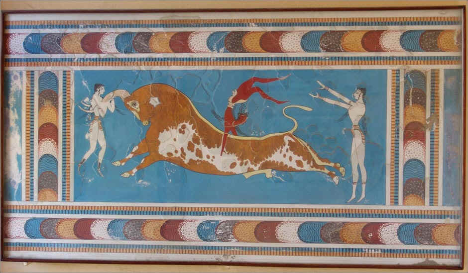 Scholars still debate the origins of the original inhabitants of Crete. The earliest evidence of human occupation of the island dates to around 7000 B.C., in Neolithic farming and fishing villages. Genetic evidence suggests that these earliest inhabitants probably came from Anatolia (modern-day Turkey) or the eastern Mediterranean coast, and Greece, though they were not Indo-European speakers. By about 2700 B.C. the Cretans were using bronze and establishing larger and larger population centers. By about 1900 B.C. they had established a strong and prosperous Bronze Age civilization based on great palace complexes, the most famous of which was at Knossos. Historians have named the civilization Minoan, after King Minos of later Greek mythology, who may or may not have actually existed. According to Greek legend, the son of King Minos, the half-human, half-bull Minotaur, lived in a labyrinth on the island of Crete. There he devoured sacrificial victims provided by the subject city-state of Athens on the Greek mainland. Minoan palaces with their many bedrooms, bathrooms, kitchens, storerooms, audience halls, corridors, stairways, and multiple stories might easily be described as a labyrinth.